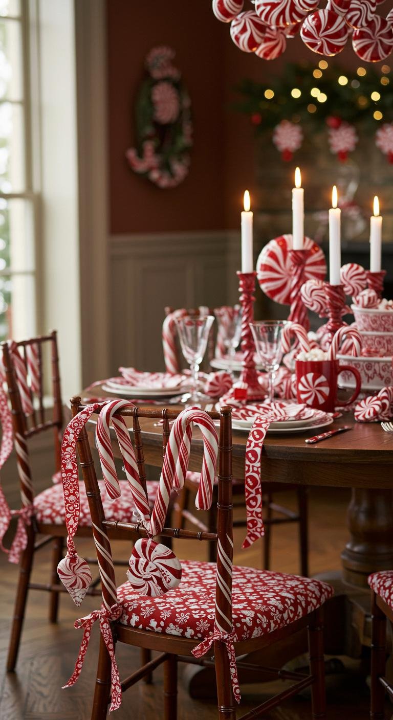 You can create charming candy cane crafts to embellish your chairs, wrapping them with festive ribbons.