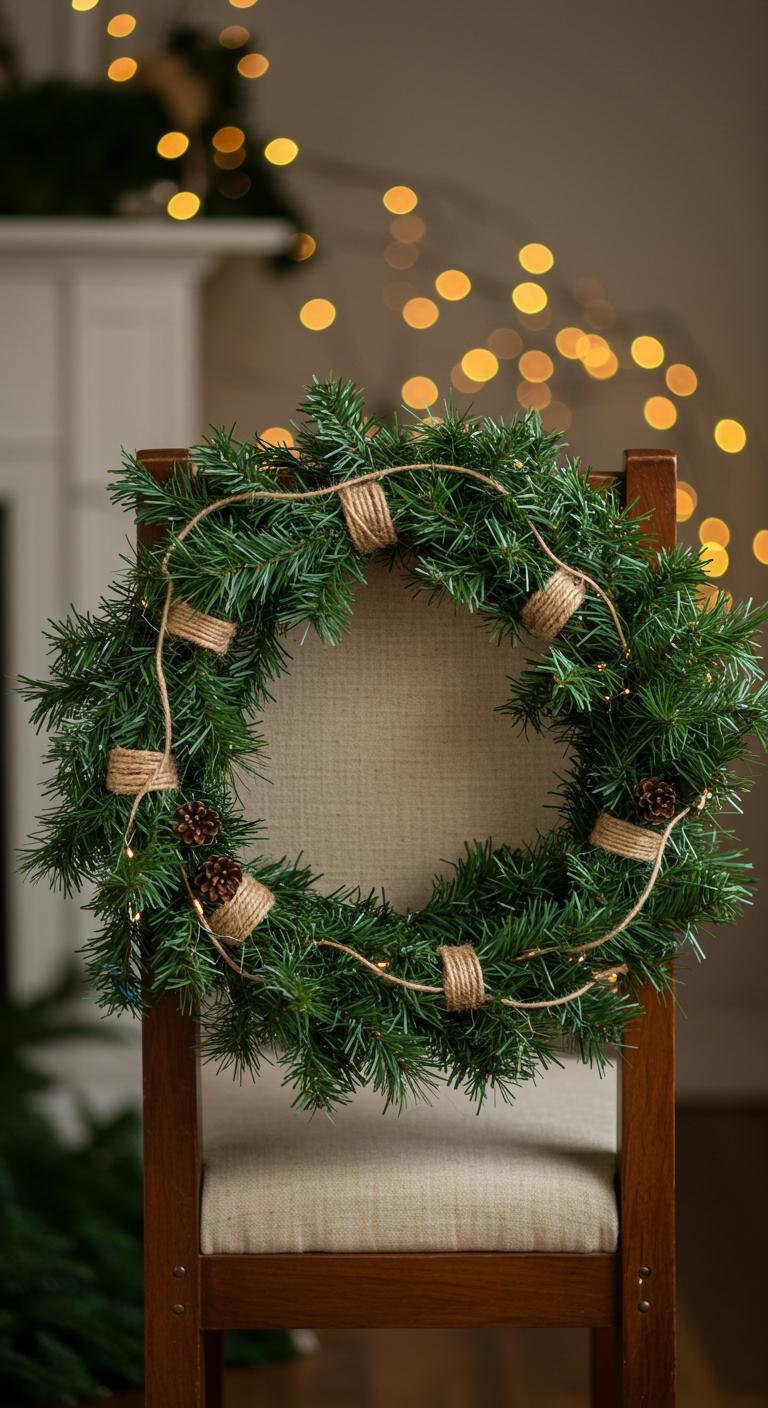 Building on the warmth offered by joyful jute twine, evergreen sprays add a fresh touch to your holiday chair decorations.