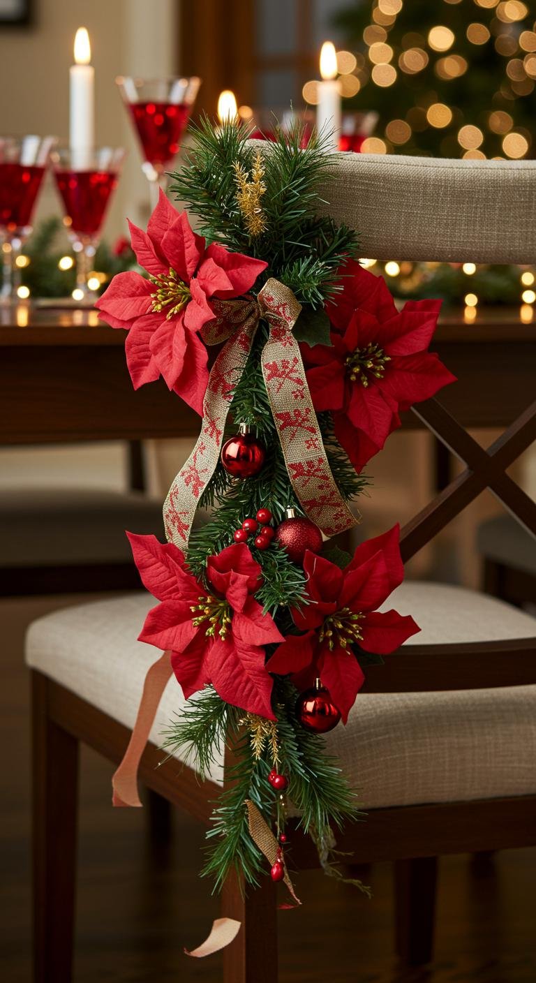 Poinsettia embellishments transform your holiday chair decorations into vibrant focal points that exude warmth and cheer. Incorporate these stunning blooms into your festive arrangements, whether draping them gracefully over chair backs or tying them with ribbons.