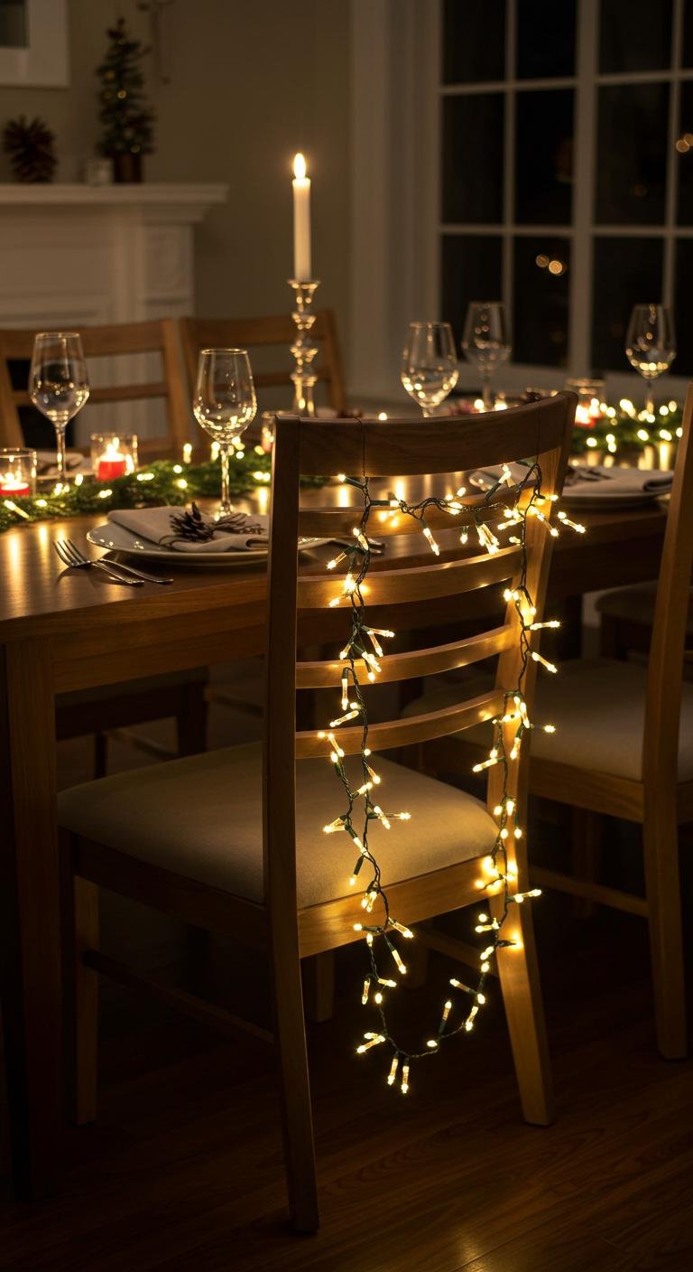 Drape them casually around each chair’s backrest, creating a cozy, twinkling ambiance that instantly elevates your table setting.