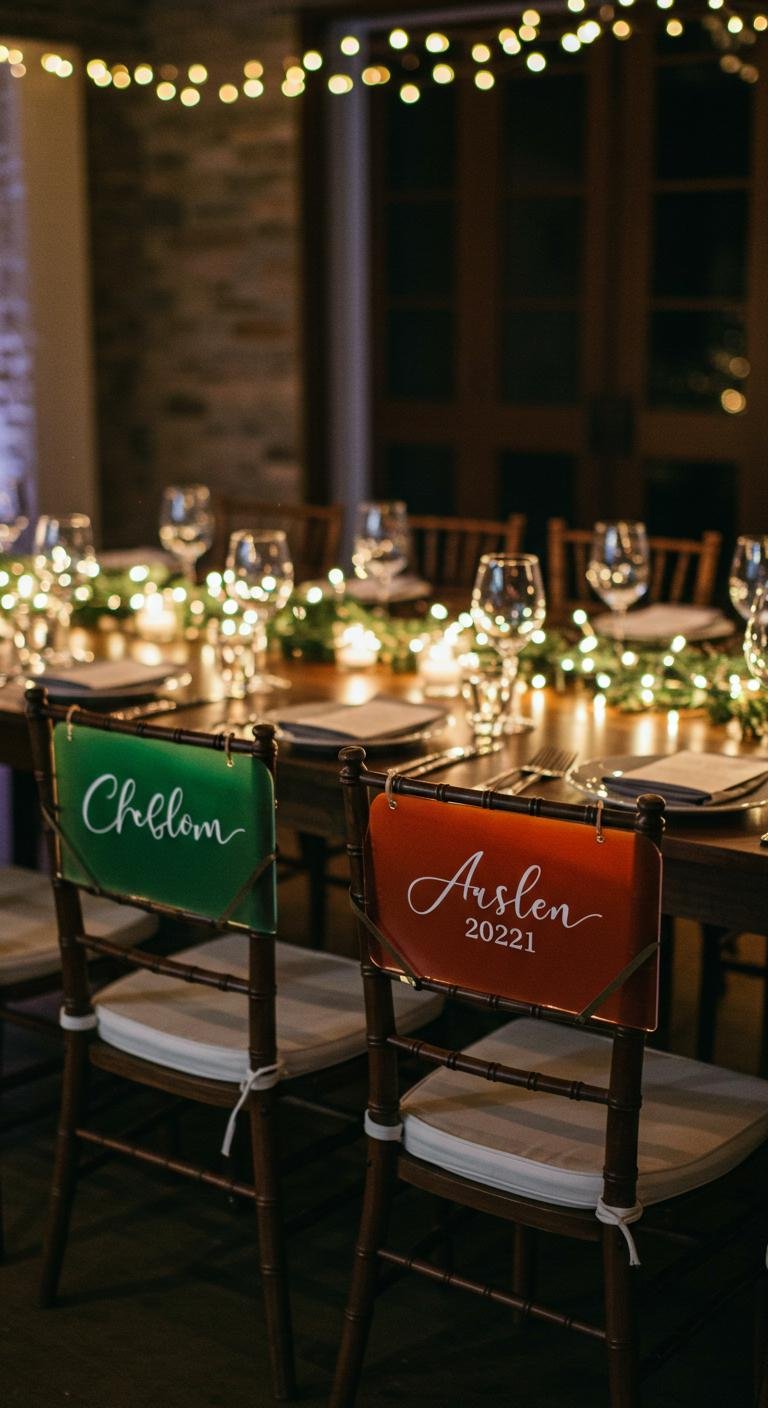 As you enhance your festive tablescape with strands of shimmering lights, consider adding a personalized touch with custom chair signs.
