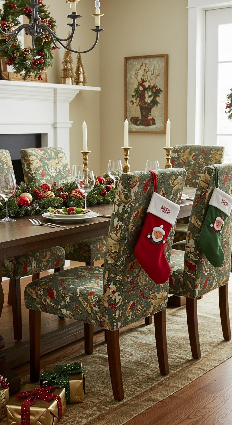 As you embrace the festive spirit with those charming mini stockings, consider the impact of holiday-themed slipcovers that can instantly transform your dining chairs into seasonal masterpieces.