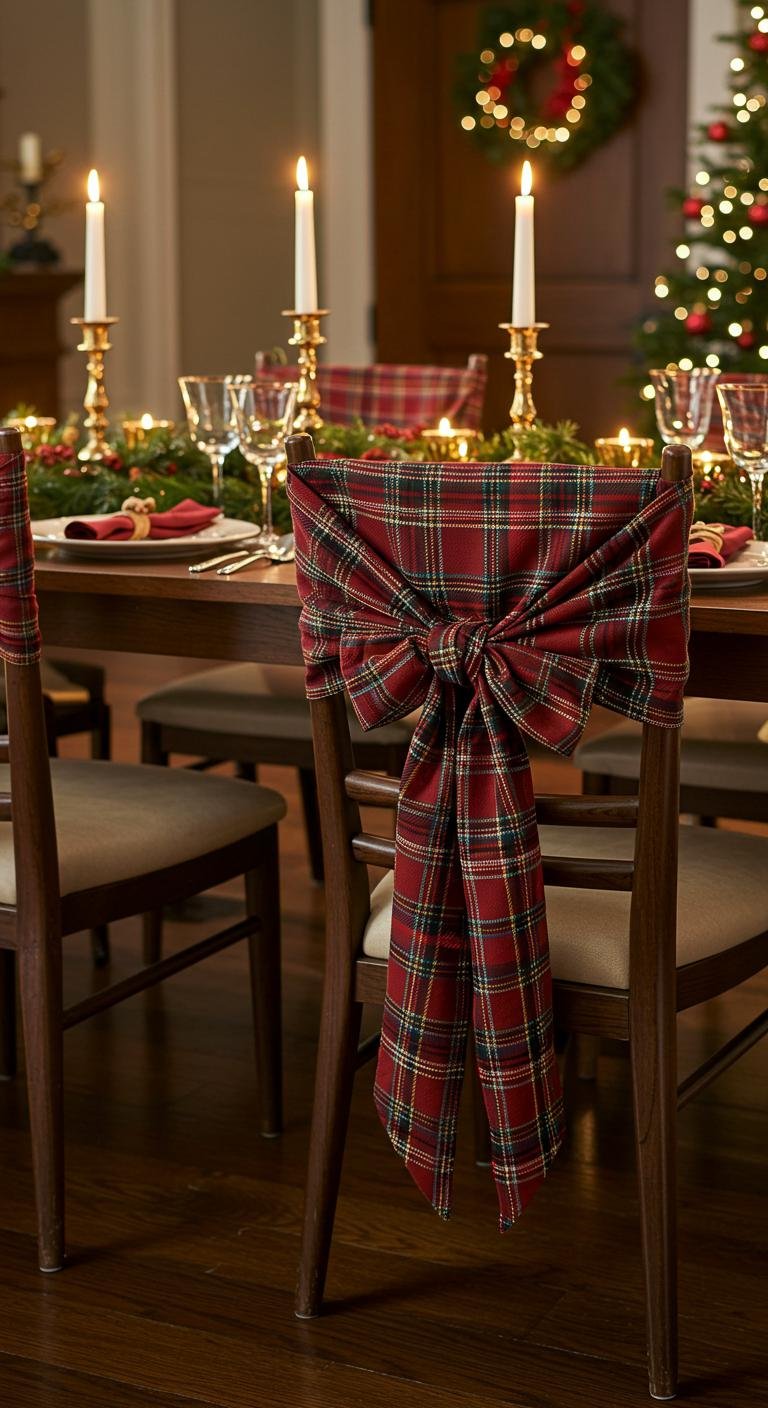 Transform your holiday gathering with the cozy charm of plaid chair sashes.
