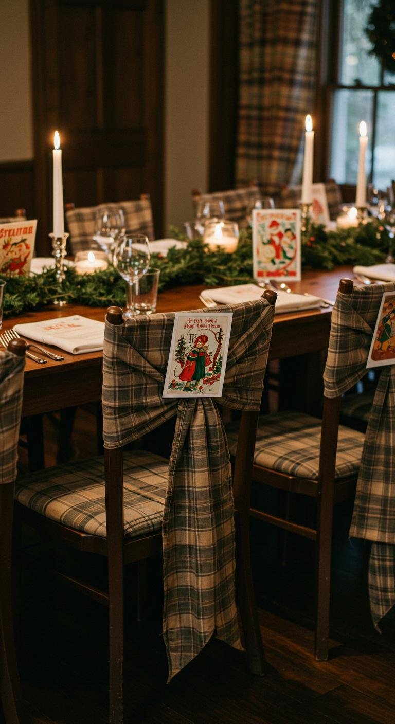 After adorning your chairs with cozy plaid sashes, consider adding a touch of nostalgia with vintage Christmas cards.