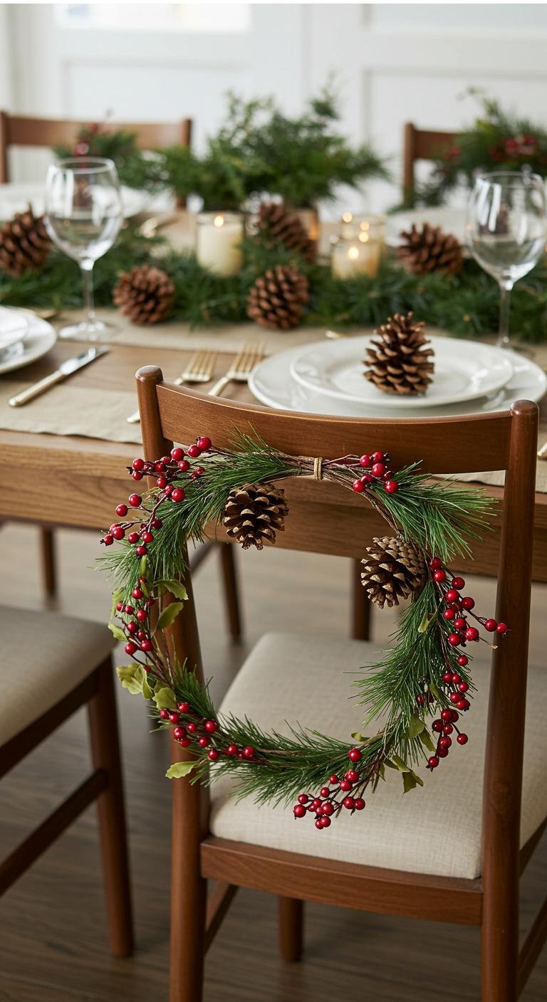 Imagine stunning pinecone centerpieces that draw the eye, complemented by delicate berry garland accents cascading down your chair backs.