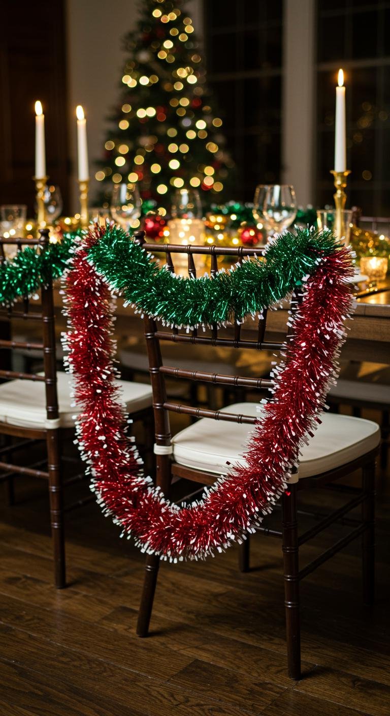 While you may envision draped tinsel garlands sparkling under twinkling lights, wrapping them around your chairs adds a playful pop of glamour to your holiday décor.