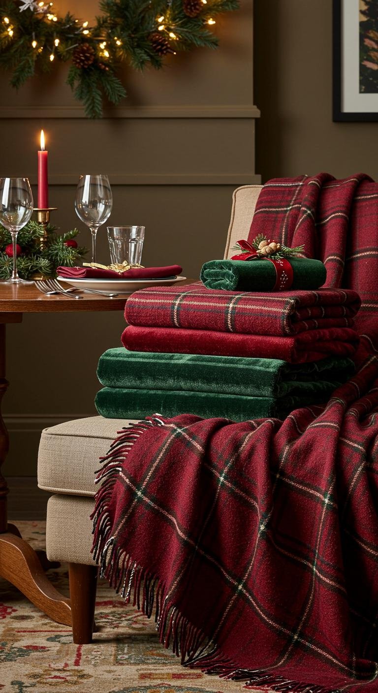 Cozy throw blankets can bring an extra layer of warmth to your holiday decor, inviting guests to snuggle up as they gather around the table.