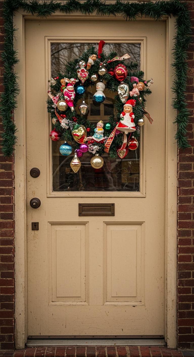Adorn it with nostalgic vintage ornaments—delicate glass baubles and whimsical figurines. Add a retro holiday wreath, bursting with cheerful colors, and tie in playful ribbons.