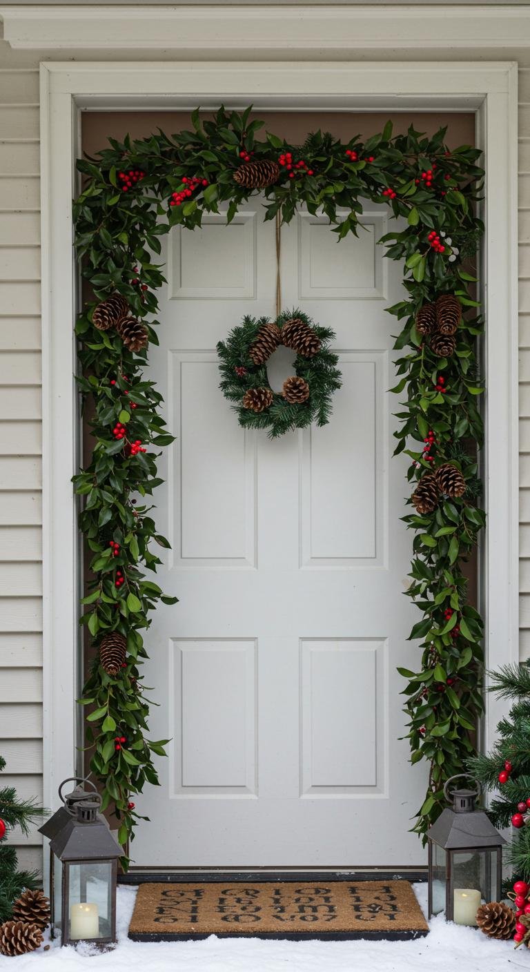 Add charming pine cone accents, clustered whimsically, to evoke a cozy woodland feel, transforming your entrance into a warm invitation for holiday cheer.