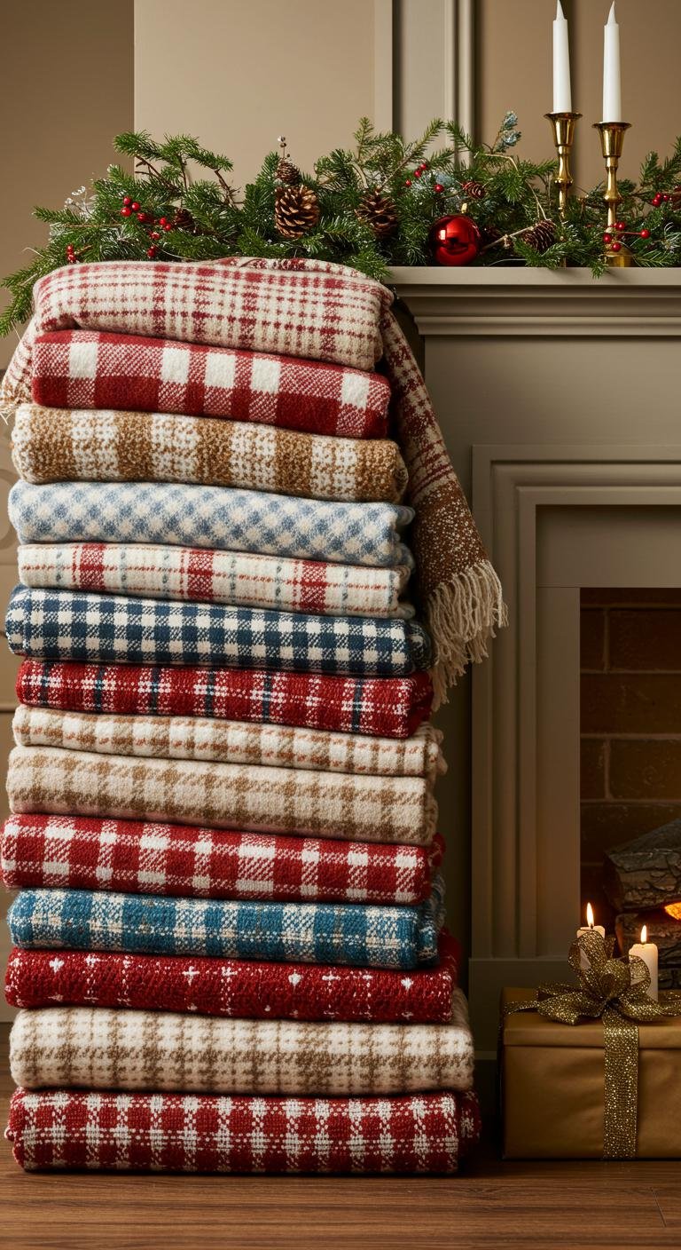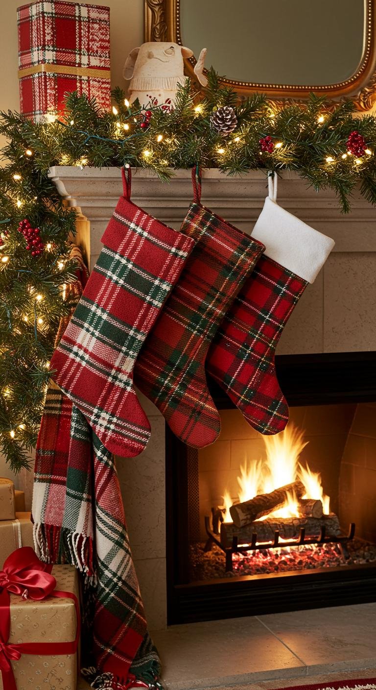 Plaid patterns burst into the scene like a festive pop of color, adding an inviting layer of texture to your Christmas mantel.