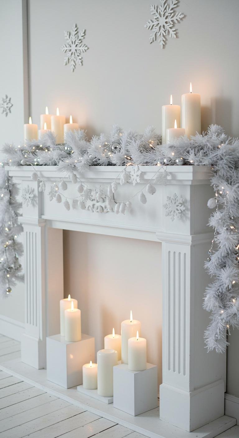 Imagine pure white candles atop sleek platforms, fluffy garlands of white textures, and delicate snowflakes artfully arranged.