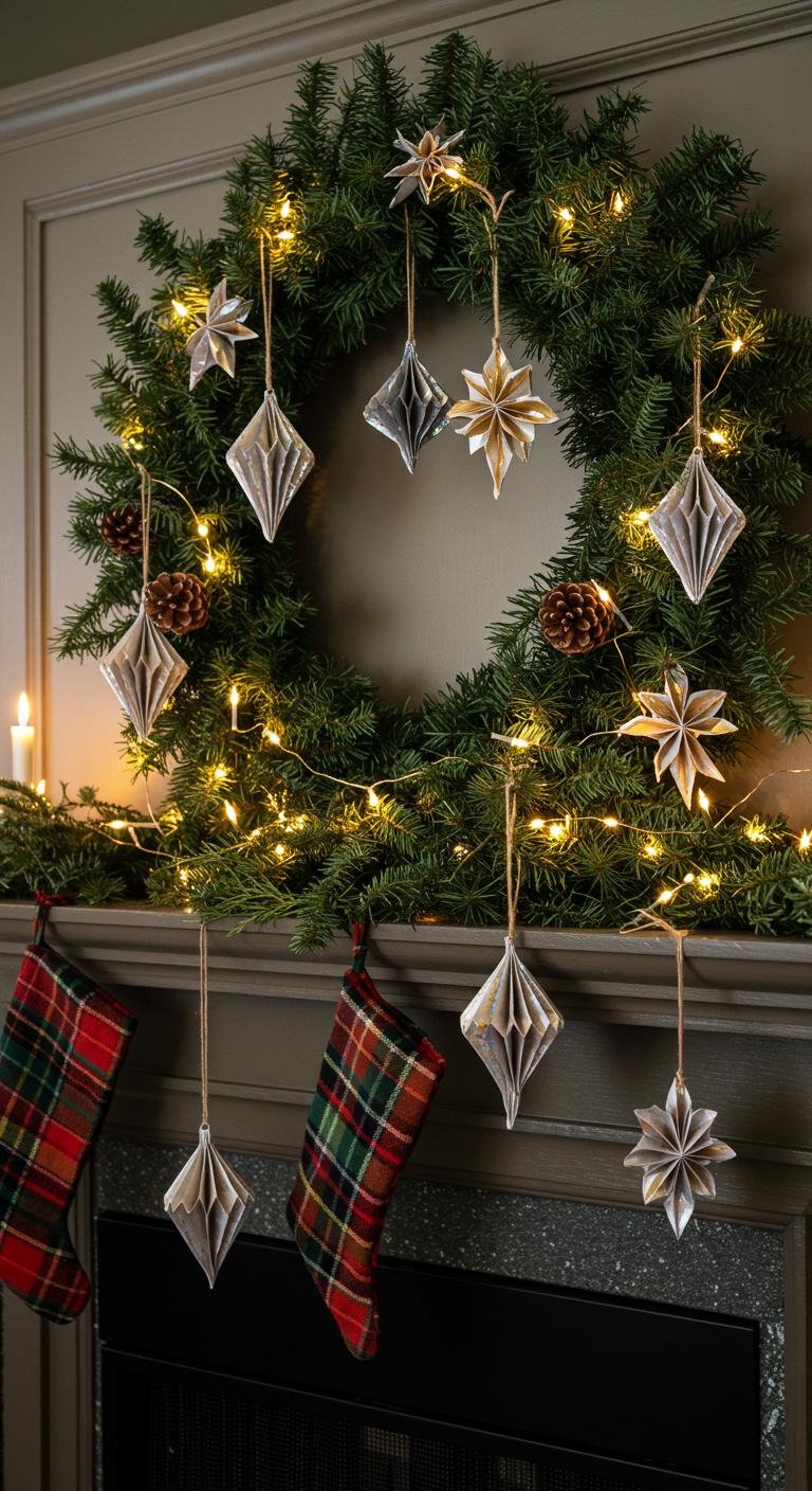 Don’t forget to design handmade ornaments from shimmering paper or natural elements. Each piece reflects your unique spirit, making your mantel a cozy haven filled with personal touches this holiday season.