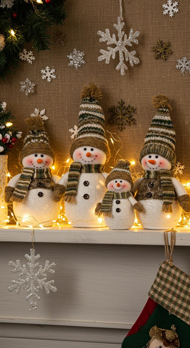 Arrange a charming snowman family atop your mantel, surrounded by playful snowflakes. Use soft fabrics like burlap and velvet to complement their frosty charm, and add twinkling fairy lights to create a joyful ambiance that captures the essence of your festive spirit.