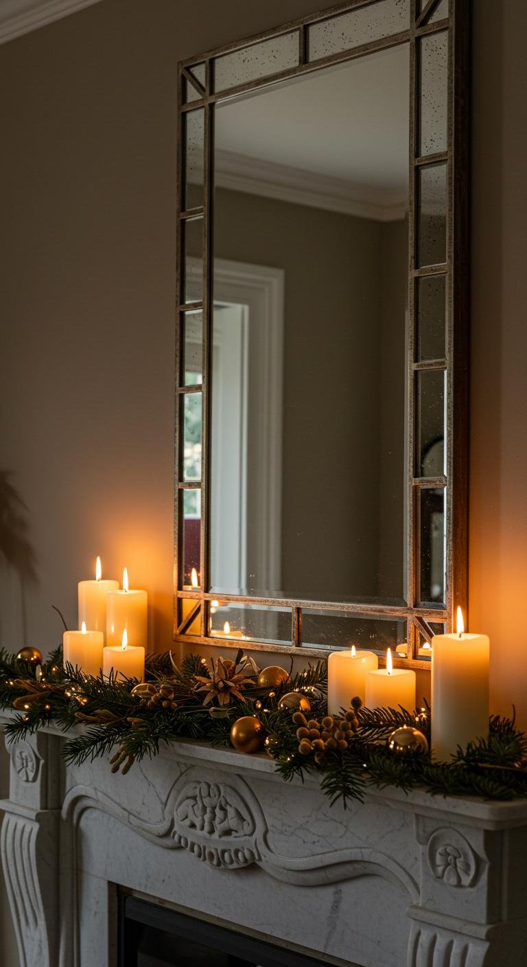 Choose a striking mirror with an elegant frame, enhancing the overall allure. Position it to reflect the warm glow of surrounding candles and festive greenery, creating enchanting plays of light.