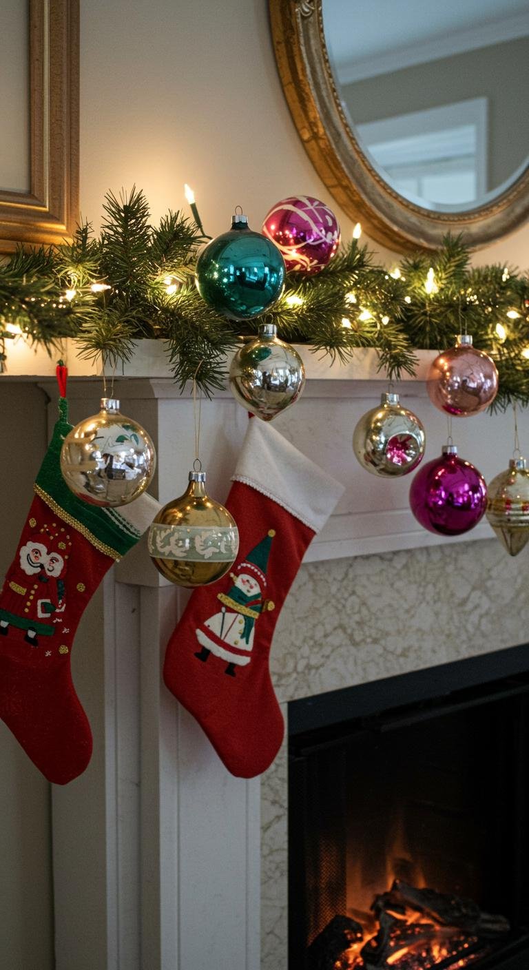 Shifting from the serene charm of a Minimalist White Wonderland, vintage Christmas ornaments bring a warm, nostalgic touch to your mantel.