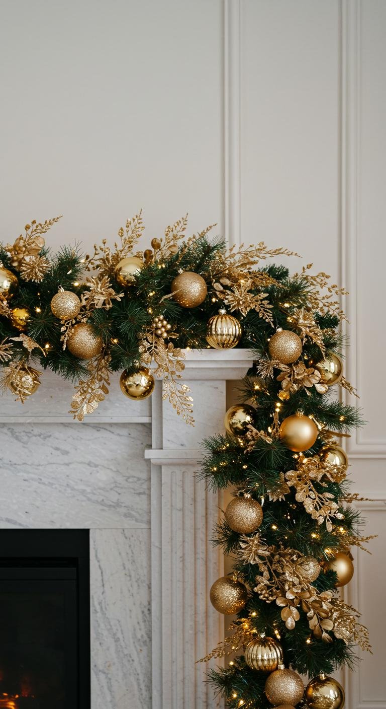 While you may feel drawn to the warmth of natural elements, don’t underestimate the transformative power of glittering gold accents in your Christmas mantel decor. Adorn your mantel with a lush golden garland, weaving through shimmering ornaments that catch the light. This dazzling touch elevates your space, adding a chic glamour that invites joy and celebration—perfect for those festive moments with loved ones.