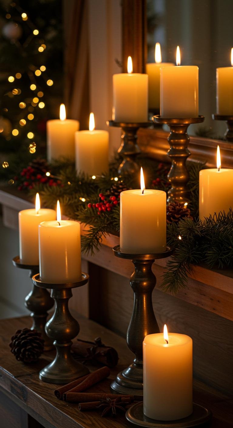 Choose fragrances like cinnamon or pine to evoke holiday cheer, while varying heights of the candles add visual interest, making your mantel a true festive focal point.