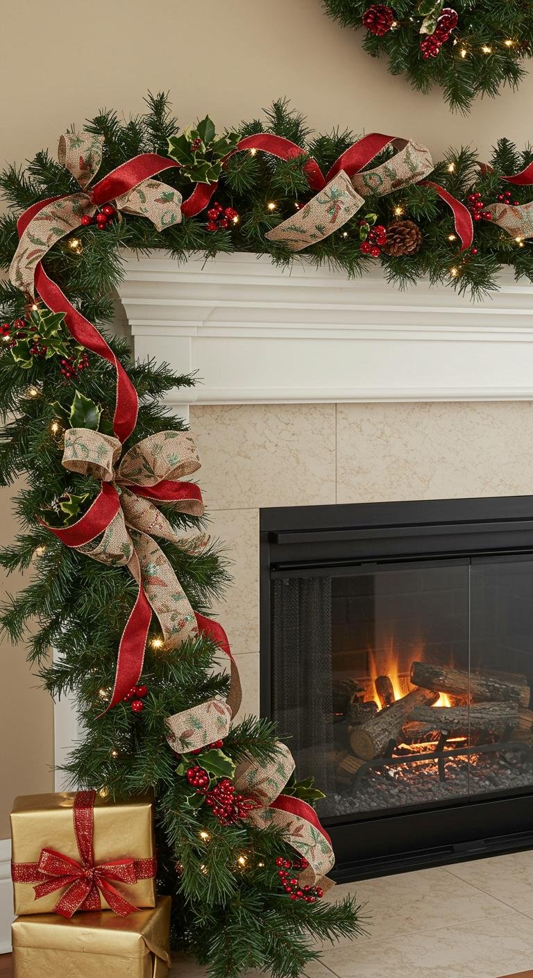Adorn your mantel with vibrant red ribbons and lush green garlands, creating a striking contrast.