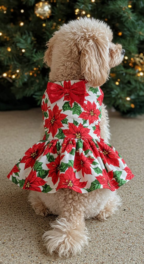 If you’re looking to add a touch of festive cheer to your pet’s wardrobe, the Festive Poinsettia Dress is a perfect choice!
