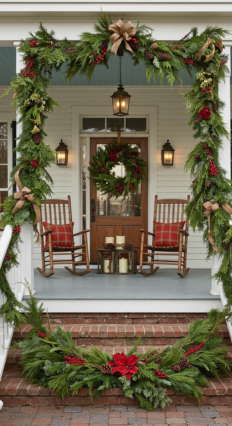 Garlands are like the drama queens of porch décor—in the best way possible. Drape them along railings, hang them around doorways, or use as rustic table runners if you’ve got the space. Mix pine, cedar, pinecones, and berries for a lush, textured look. You can grab garlands from local shops or make your own with yard cuttings, which is super sweet and budget-savvy. Big, beautiful garlands immediately dial up the festive ambiance and make your porch feel like a true winter wonderland.