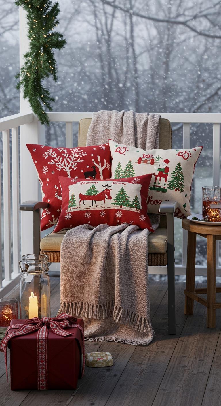 Make your porch a go-to cozy hangout with some festive cushions and throws. Mix in holiday-themed cushions or stick with classic reds and greens, layering them on rocking chairs or benches. Toss in a warm blanket for those chilly evenings—you’ll thank yourself later! Bonus points if you sew your own cushion covers with seasonal fabrics, but there are plenty of budget-friendly ready-made options too. You can even jazz up old cushions with some easy embellishments to fit the holiday mood.