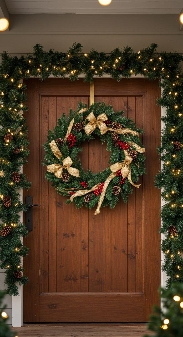 Nothing says holiday like a classic evergreen wreath hanging front and center on your door. I love how simple it is to make your own with pine branches, a sturdy wire frame, and some festive extras like red ribbons or pinecones. Bonus: You can use clippings from your yard or snag supplies at craft stores without breaking the bank. To take it a step further, drape a garland along your porch railing and tuck in some berries or dried oranges — it adds a pop of color and that old-school holiday texture. Little touches like these instantly turn your porch into a warm welcome zone that just invites people in.