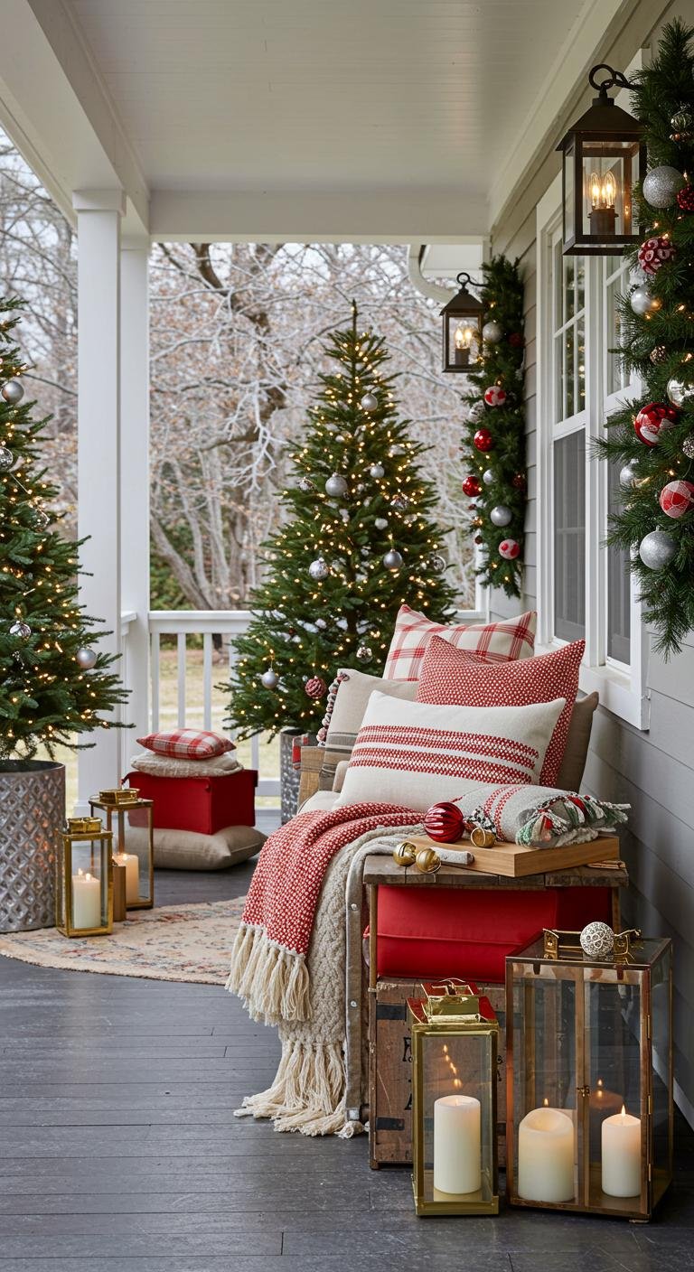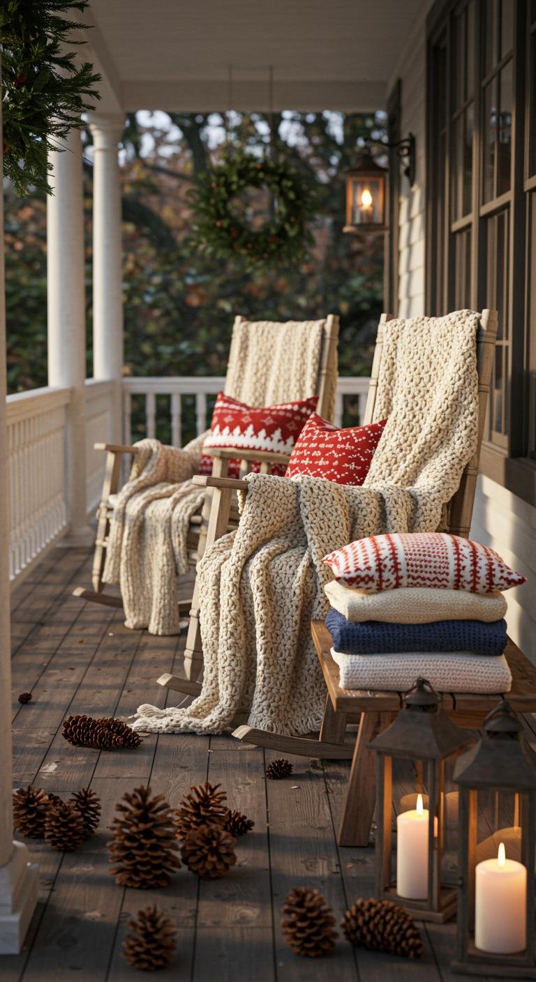 There’s something so inviting about layering textures, right? I’m all about throwing chunky knit blankets and some playful holiday pillows onto porch furniture to create that cozy vibe. Plus, mixing textures — like a soft throw with rough burlap pillows — keeps things interesting and totally touchable. Thrift stores and online shops are gold mines for affordable festive blankets, so no need to splurge. Add in some wooden crates as extra seating or small tables, and suddenly your porch feels like a comfy corner ready for catching up or sipping warm drinks.