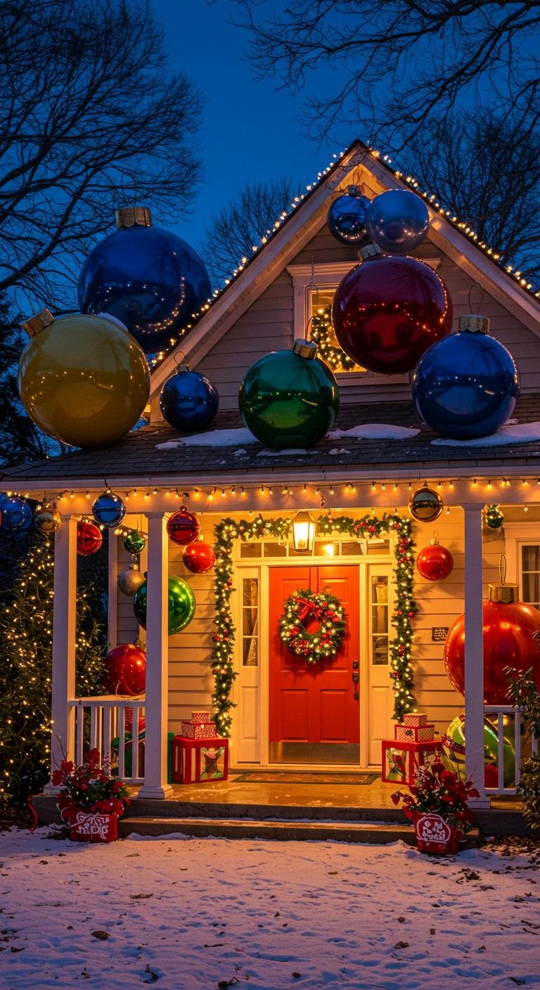 Big, bold ornaments hanging from the roof or placed around the porch instantly add a playful, whimsical touch. You can grab affordable options from craft stores or even DIY your own using painted bowling balls or balloons — how fun is that?! Mixing large colorful baubles with smaller ornaments layers the look in a way that’s both cheerful and eye-catching. It’s a little unexpected, but guaranteed to bring smiles to anyone passing by.