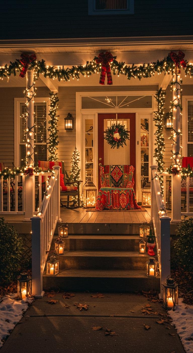 Lighting really sets the vibe, especially when it’s cold and dark outside. Wrapping fairy lights along railings or columns gives off that soft, magical glow we all crave in the holidays. I always reach for warm white bulbs because they feel friendlier and cozier than harsh whites or blues. Lanterns with flameless candles make great accents — they add both safety and style, minus the worry of open flames. You can even find budget-friendly ones at dollar stores! Stringing all these lights together not only makes your porch prettier but also keeps your guests steady on their feet as they come and go.