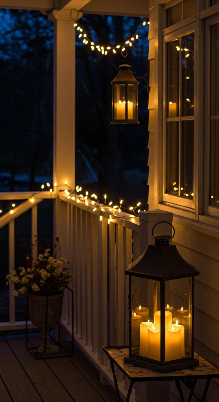 Oversized lanterns are such a stylish way to add both light and interest to your porch. Choose some big, eye-catching designs and fill them with flameless candles — they’re safer but still give that warm, flickering glow. Bonus points if you pick lanterns in colors that pop against your porch background or even personalize them with a little DIY paint job. Pairing these lanterns with plush seating and pillows makes the whole setup feel like a cozy, charming getaway right outside your front door.