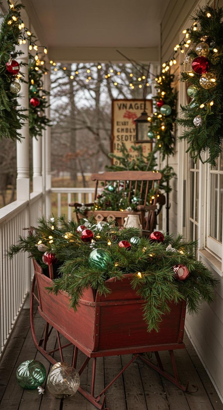 Vintage-inspired bits are some of my favorites because they bring so much personality and nostalgia. Imagine a weathered wooden sleigh piled high with greenery, ornaments, or wrapped presents. Antique stores and flea markets are treasure troves for unique pieces like rustic signs saying “Welcome” or “Merry & Bright.” I also love using simple wooden crates as rustic side tables to hold these finds. They make your porch feel lived-in and full of holiday spirit — like it’s been welcoming friends for generations.