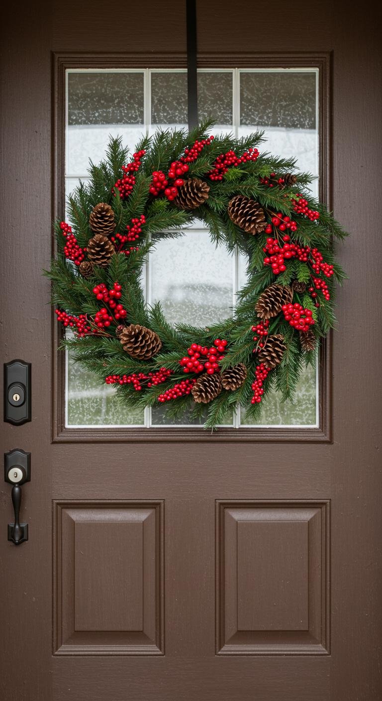 Choose wreath materials like evergreen, berries, or pinecones, accented with seasonal colors like vibrant reds and cheerful greens.