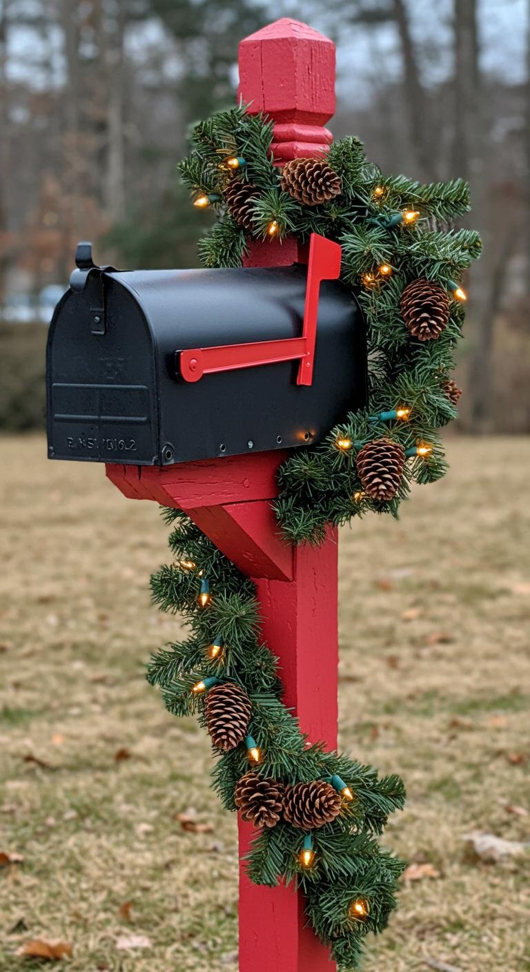 Transforming your mailbox into a festive focal point can effortlessly elevate your holiday curb appeal. Start by applying cheerful, festive mailbox paint to create a vibrant base. Then, wrap a beautiful mailbox garland around the post, adorned with pinecones and twinkling lights. This simple makeover invites warmth and joy, making it a delightful surprise for your mail carrier and visitors alike.