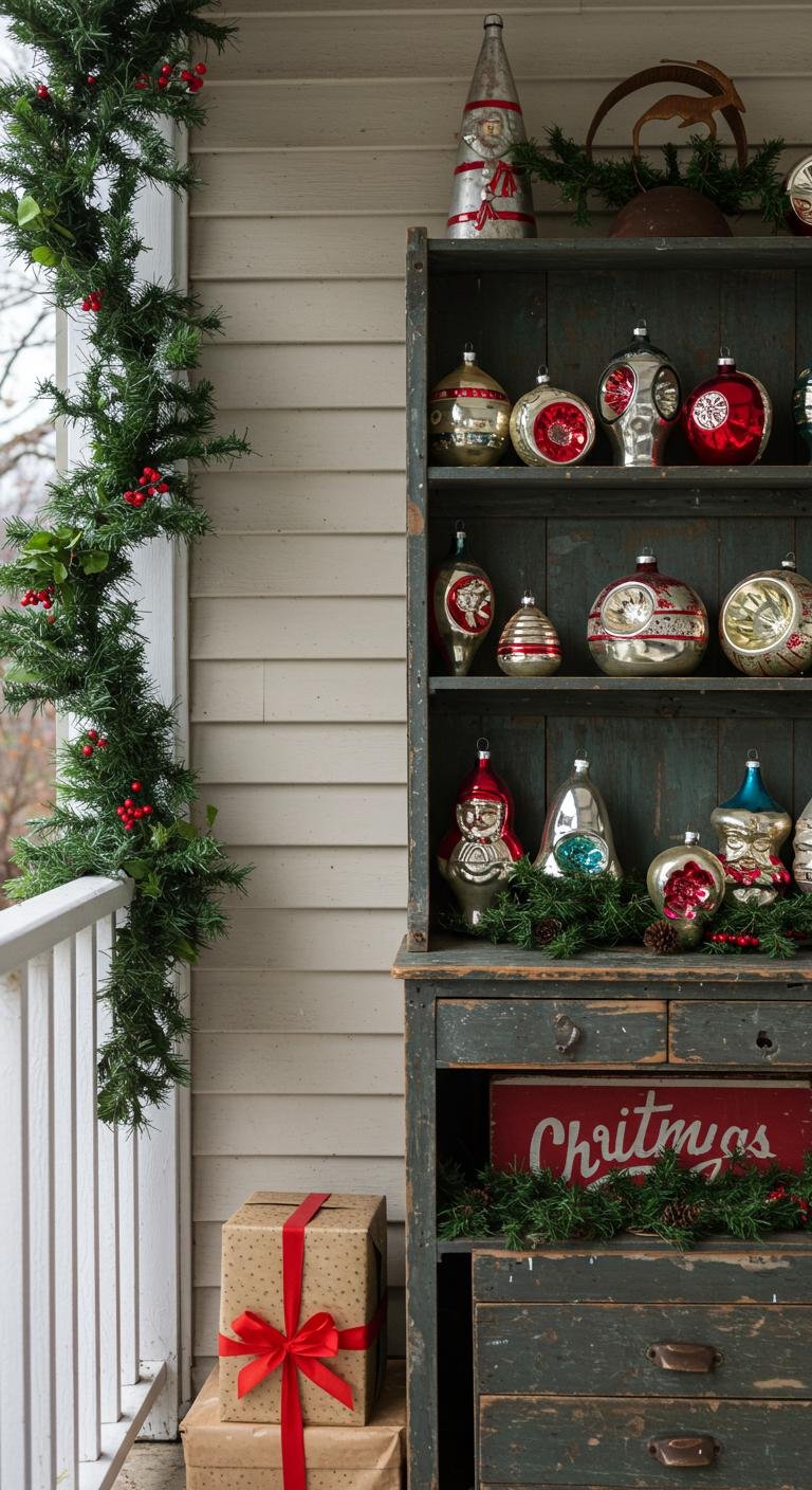Hang retro garlands around your porch and showcase nostalgic vintage ornaments on a beautifully weathered shelf.