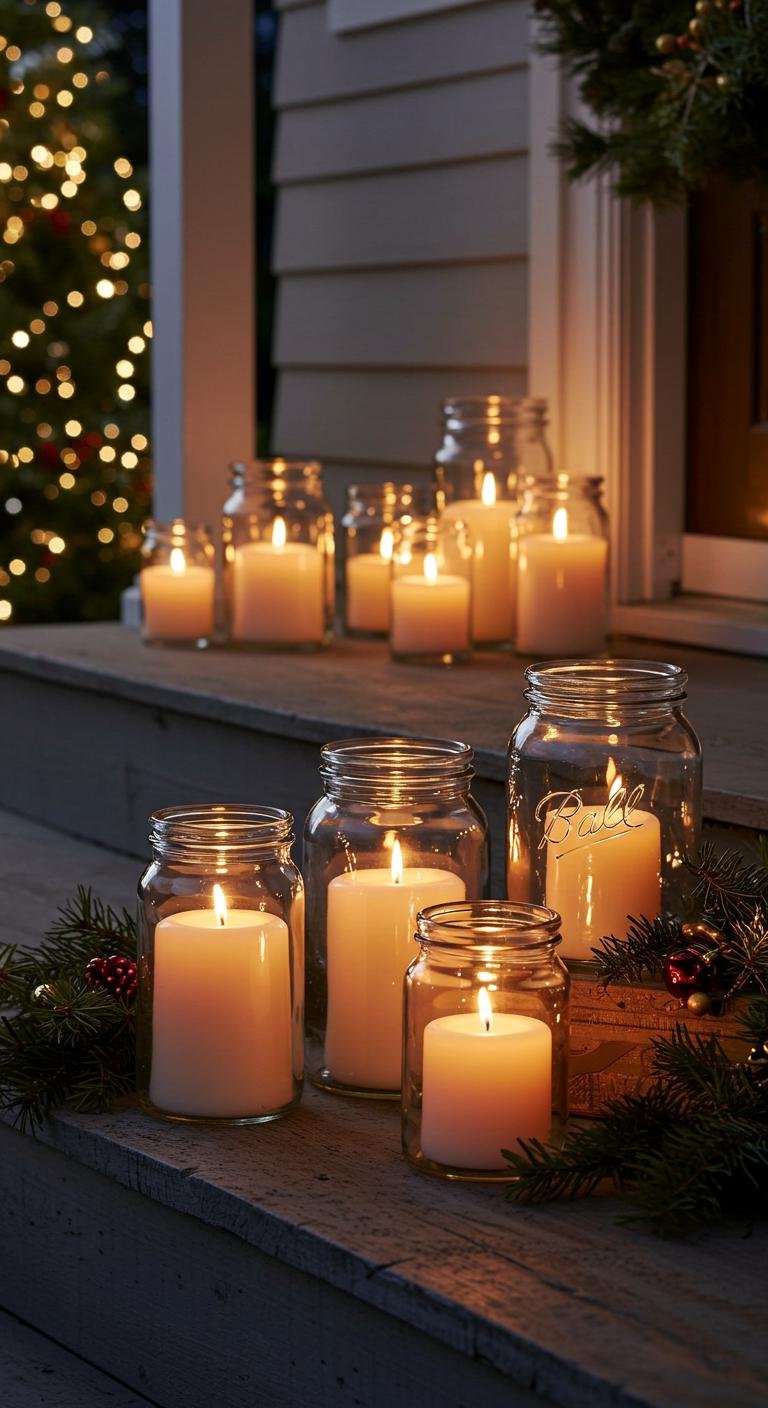 To elevate the warm, inviting feel of your porch during the holidays, consider incorporating candlelit jars into your decor.