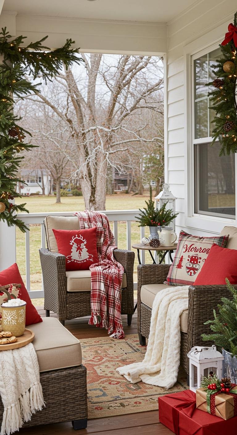 Creating a cozy atmosphere on your porch during the holidays can be as simple as adding furniture that invites relaxation, adorned with warm holiday throws.