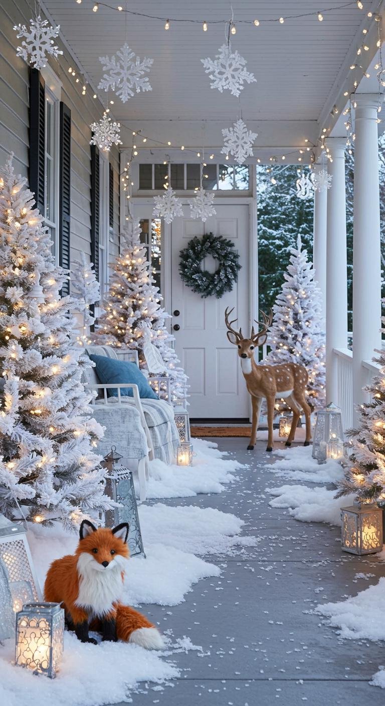 Transform your porch into a magical winter wonderland, where shimmering whites and icy blues create a serene escape right at your doorstep.