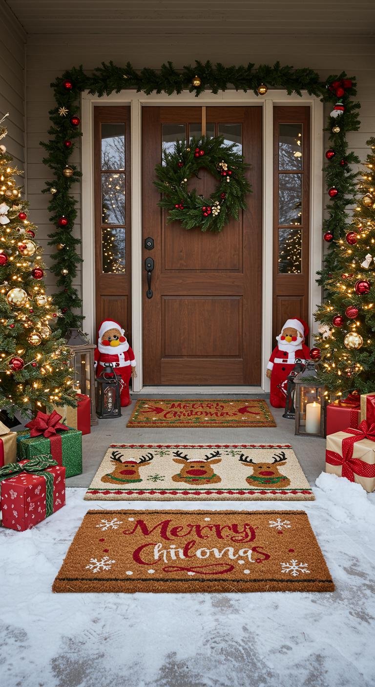 Transform your porch’s entryway with Christmas-themed welcome mats that set a festive tone before guests even step inside.