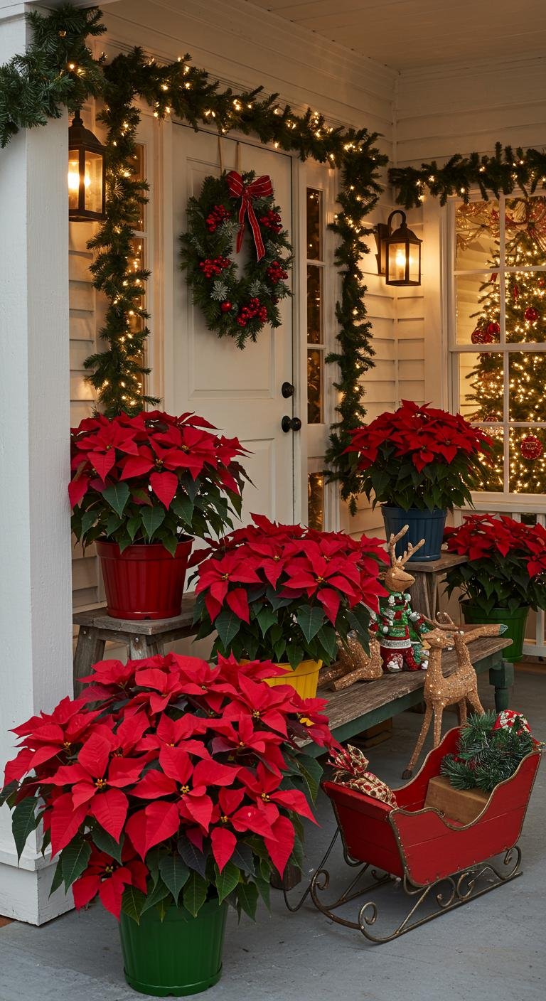 After the whimsical charm of reindeer and sleigh decor, your porch can benefit from the vibrant pops of color that poinsettia accents provide.