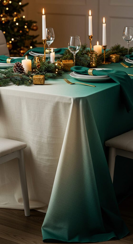 A beautifully set Christmas table featuring an ombre tablecloth that transitions from deep green to soft ivory. The table is adorned with gradient napkins and elegant tableware, creating a sophisticated and festive atmosphere. Soft lighting adds warmth to the scene, enhancing the enchanting and unforgettable vibe of the tablescape.