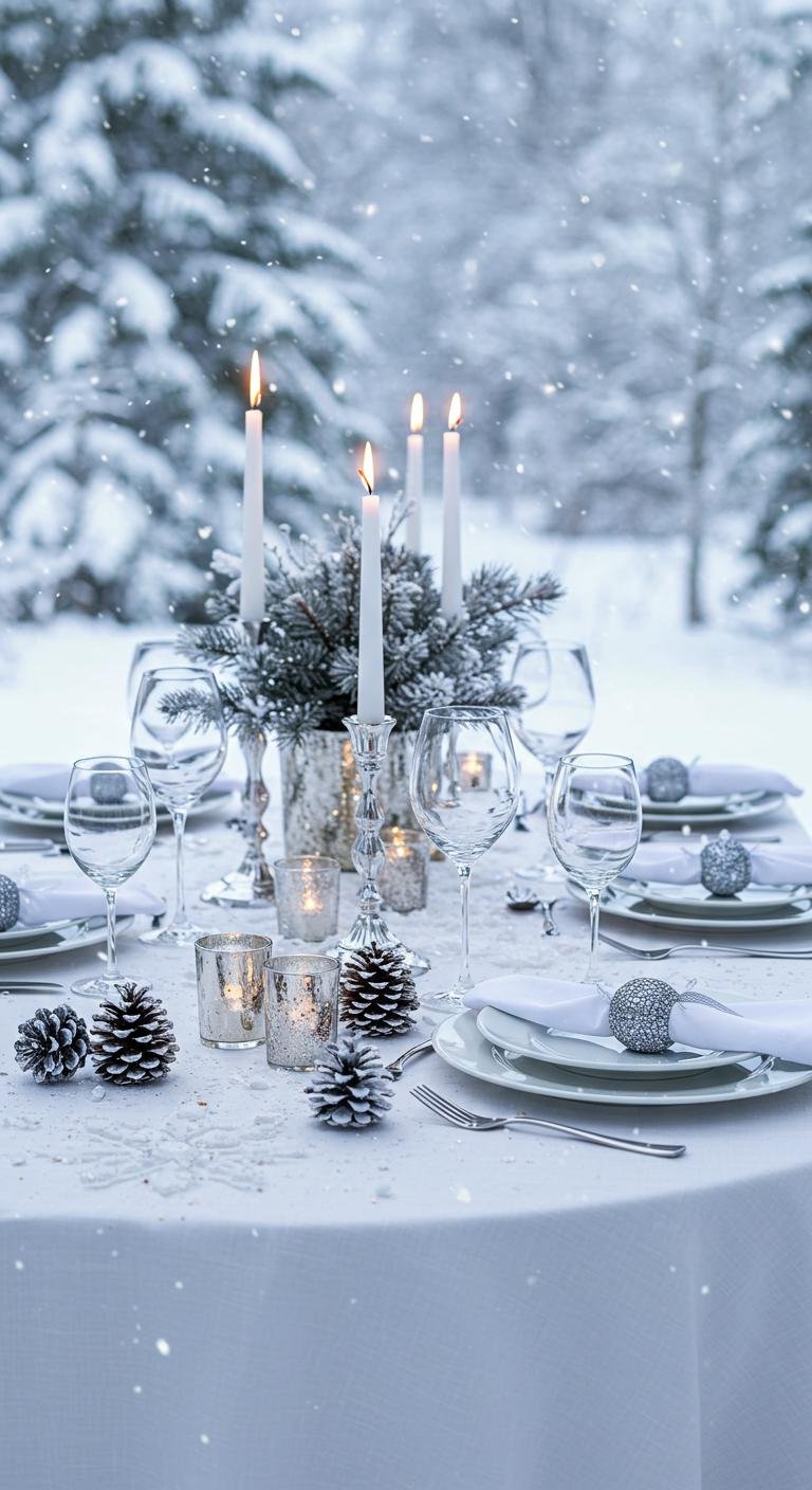 Add festive snowy accents like frosted pinecones and glistening glassware to create a magical setting, inviting guests to bask in the elegance and tranquility of the season.