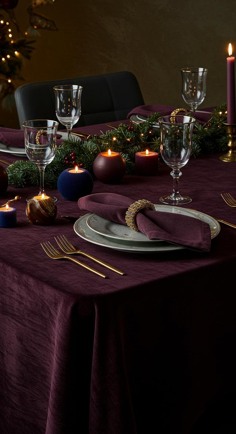 Opt for rich velvet tablecloths that drape gracefully, creating a warm backdrop. Enhance your setting with plush napkin rings, adding an element of tactile indulgence.