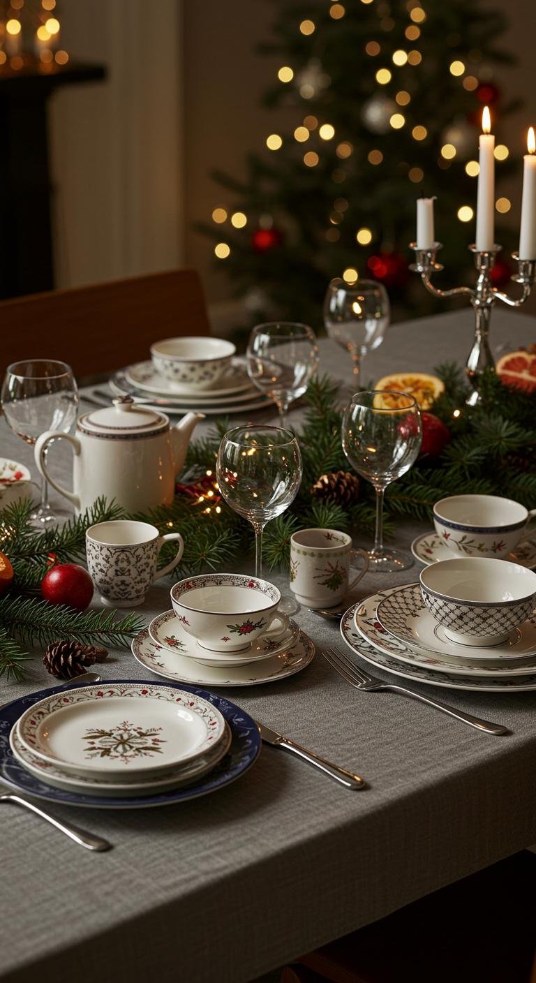 While you might think a perfectly coordinated set of china is essential for an elegant Christmas table, embracing the mismatched china charm can add a playful yet refined touch to your festive gatherings.