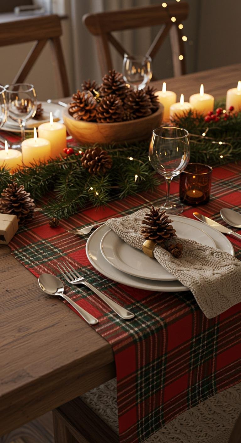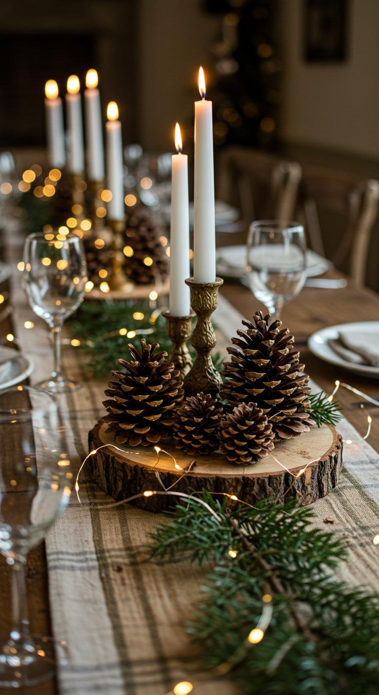 Use natural pine cone centerpieces atop a soft burlap or plaid rustic table runner to create warmth.
