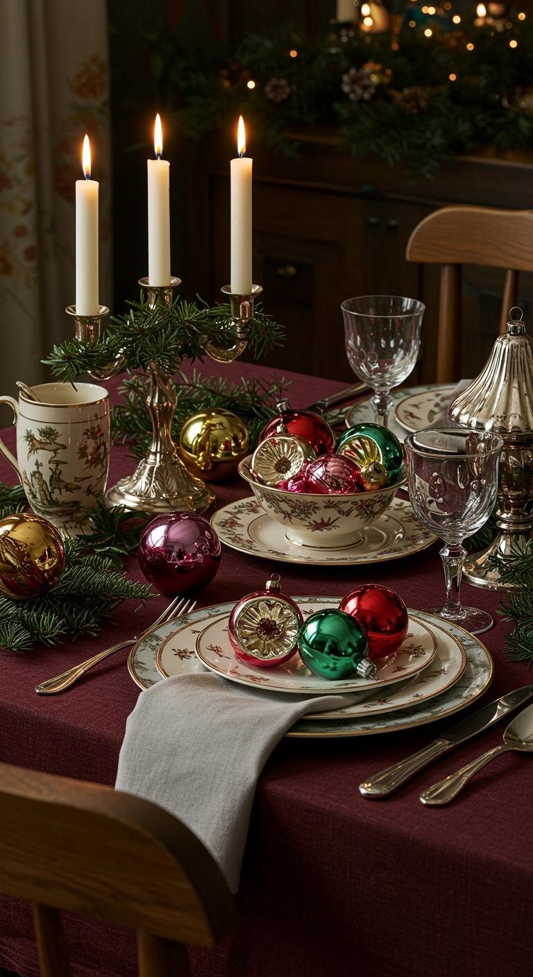 Picture vibrant vintage ornaments nestled among elegant antique tableware, each piece telling a story of holiday cheer.
