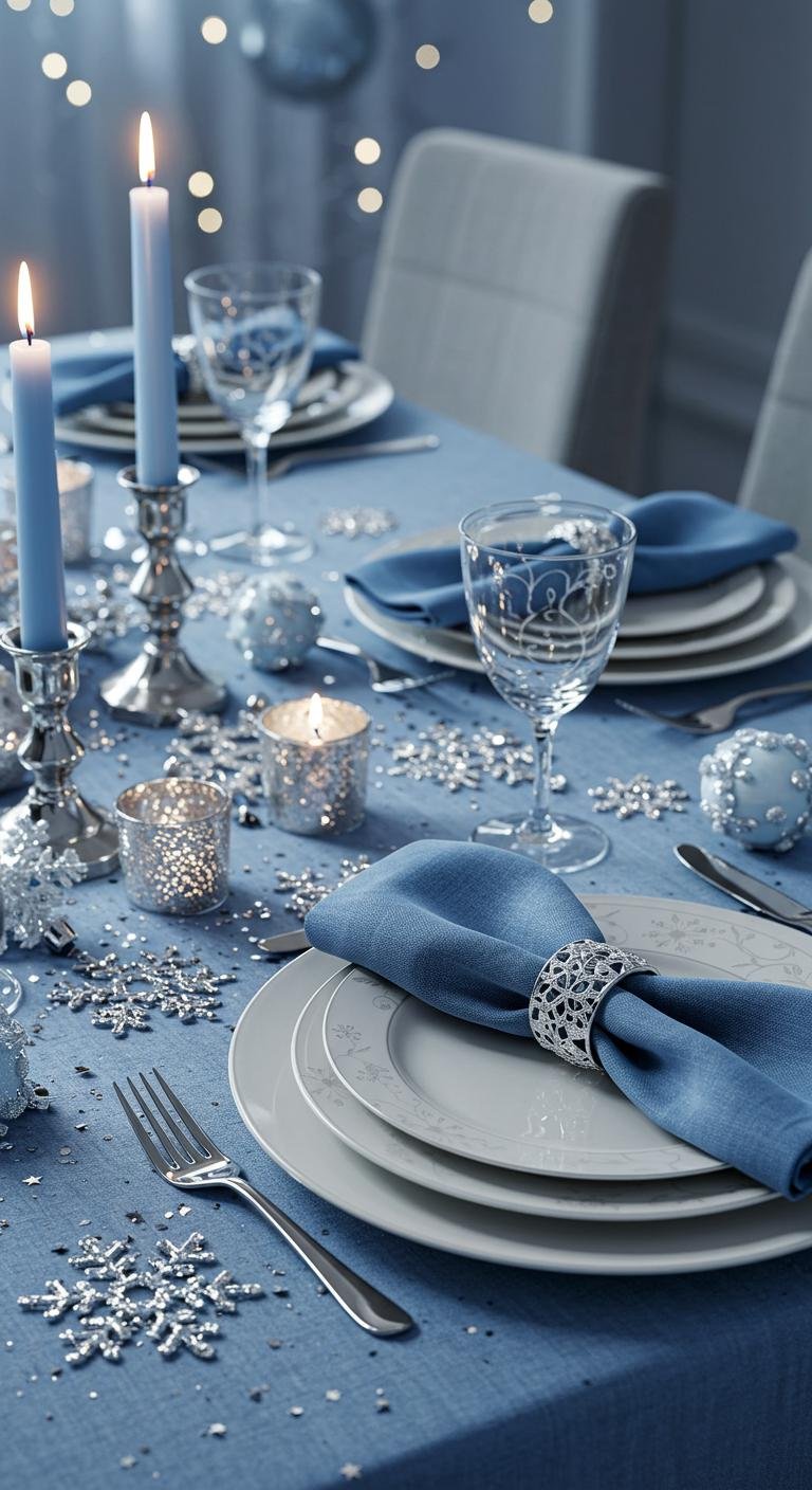 Transform your holiday table into a winter wonderland with a stunning Traditional Silver and Blue theme.