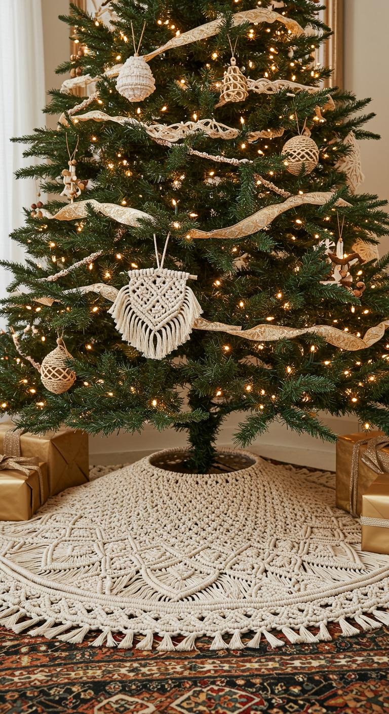The intricate macrame techniques create a stunning, textured display, weaving together fibers that evoke a natural vibe. This unique accent complements your bohemian decor, inviting warmth and style beneath your tree.