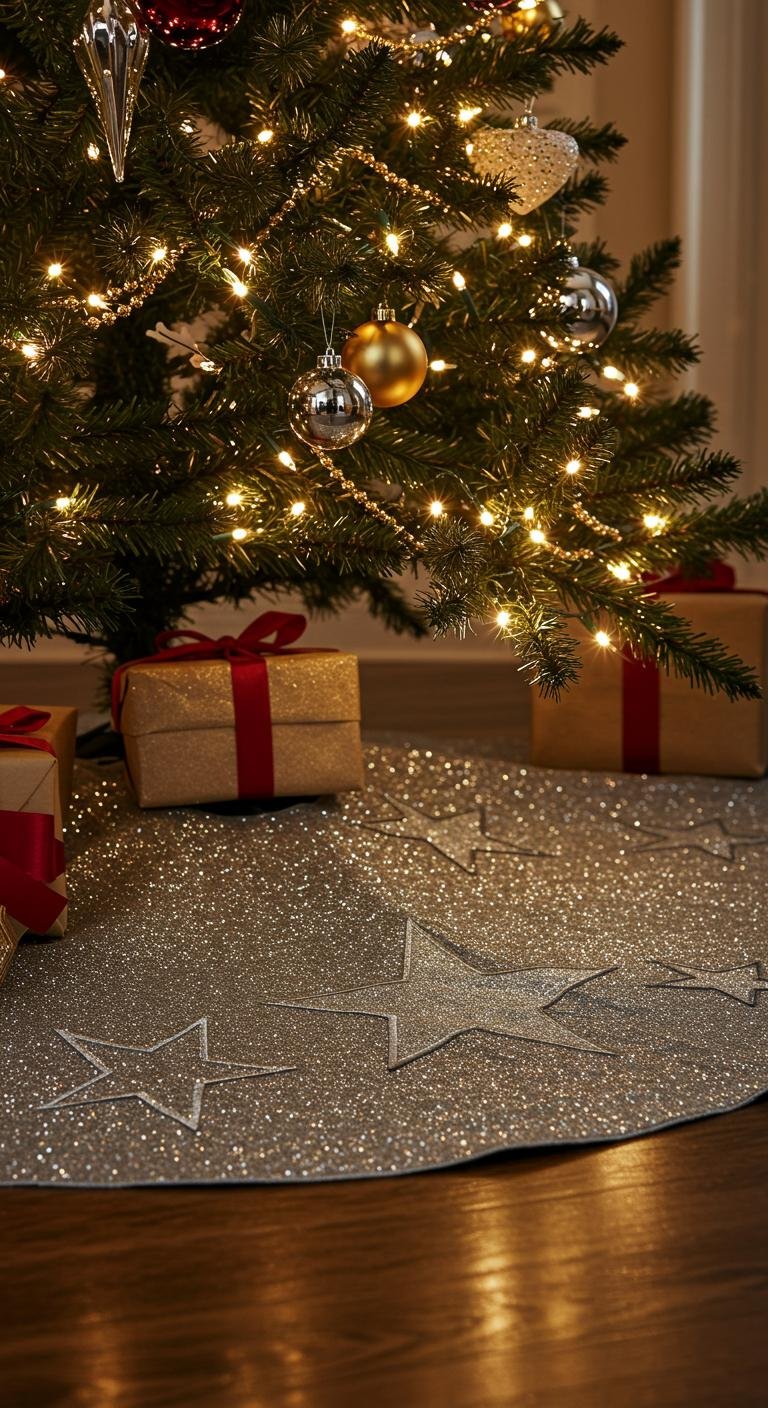 Amidst the twinkling lights of the season, a glittery silver star tree skirt adds a touch of elegance and shimmer to your holiday display.