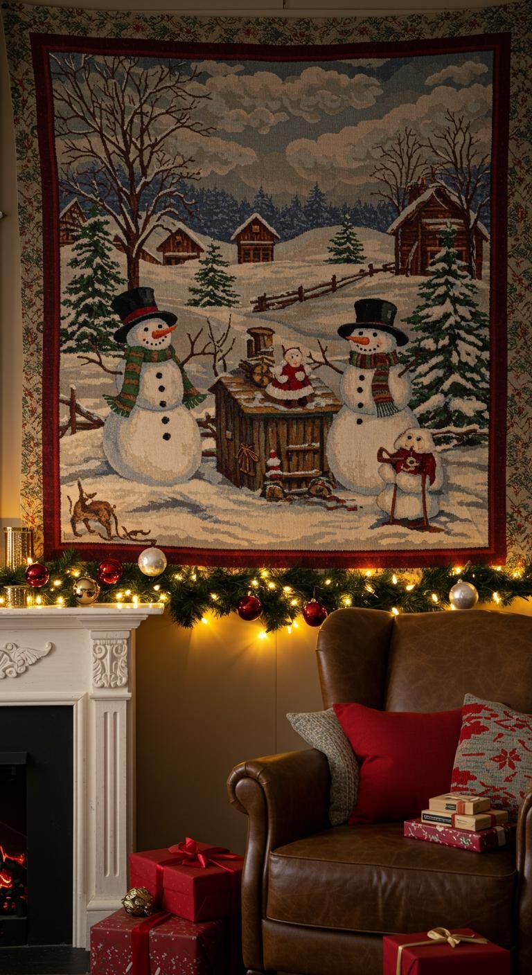 Explore holiday tapestry styles, from whimsical snowmen to rustic winter landscapes, and embrace festive fabric choices that add texture and color.