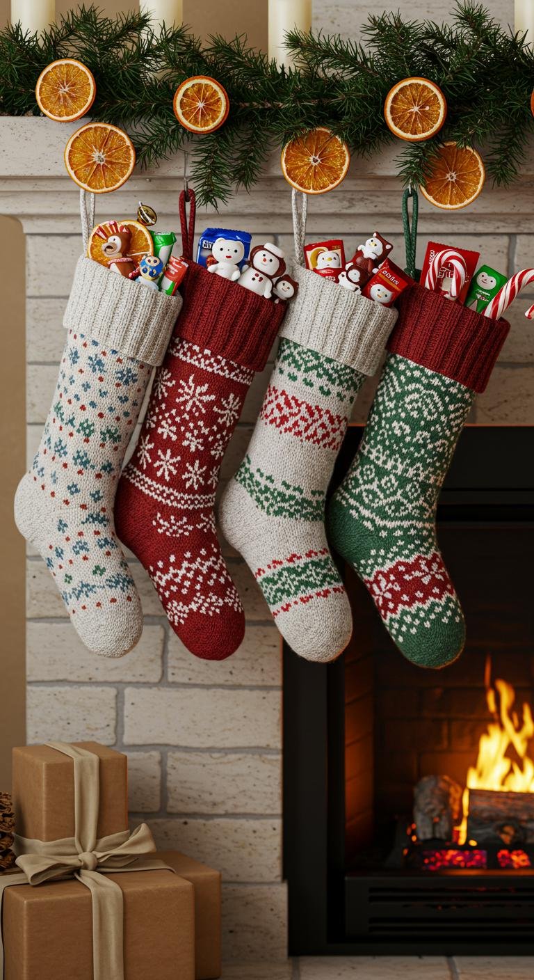 As the vibrant charm of dried orange slice garlands brightens your home, consider adding another layer of warmth and whimsy with a beautifully arranged knitted stocking display.